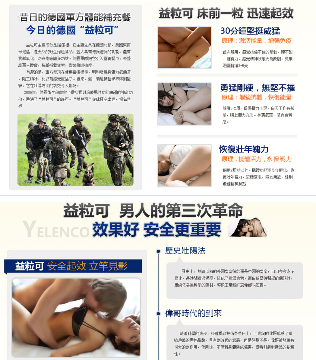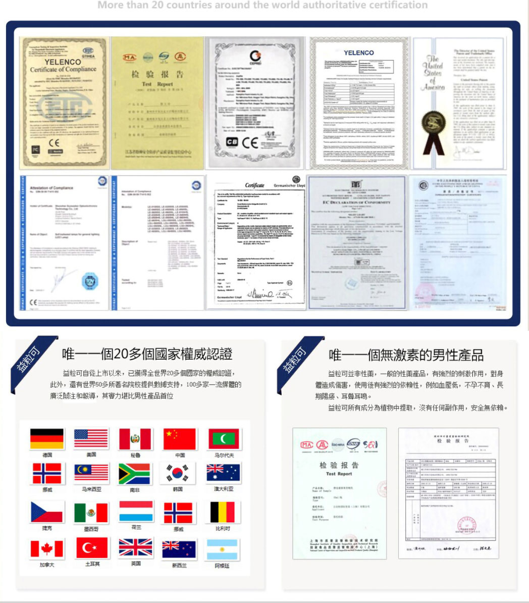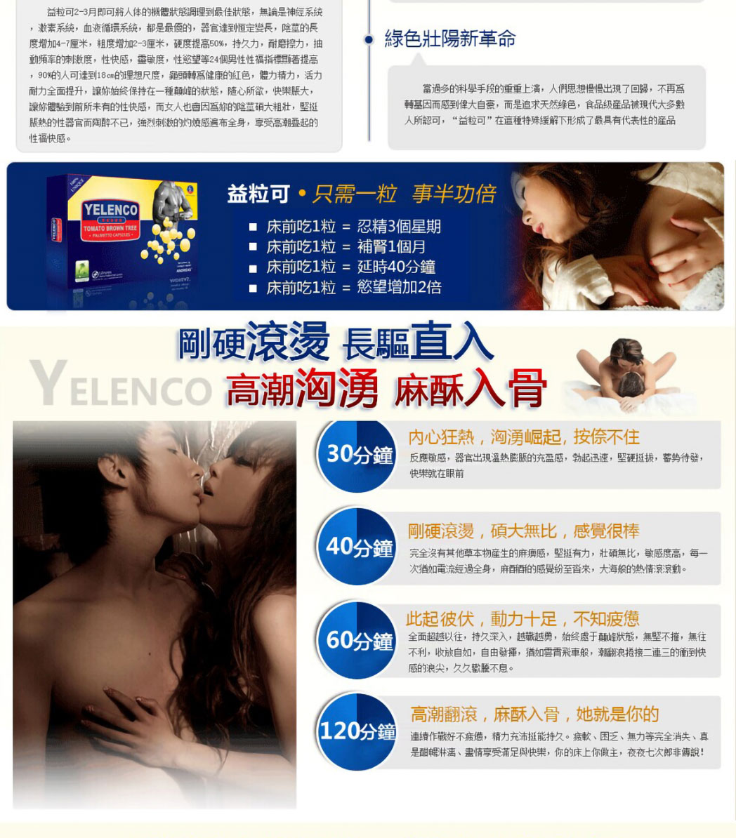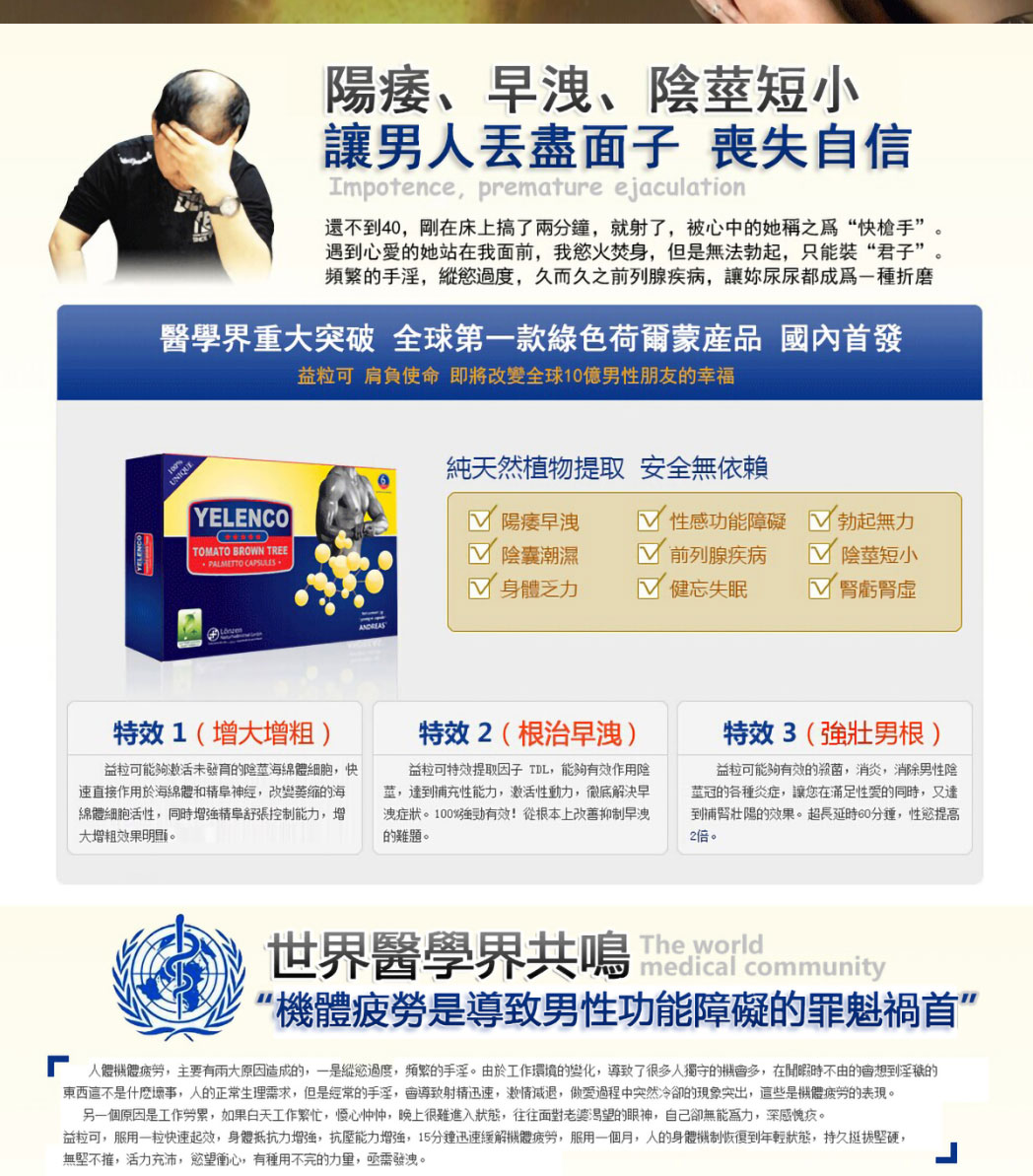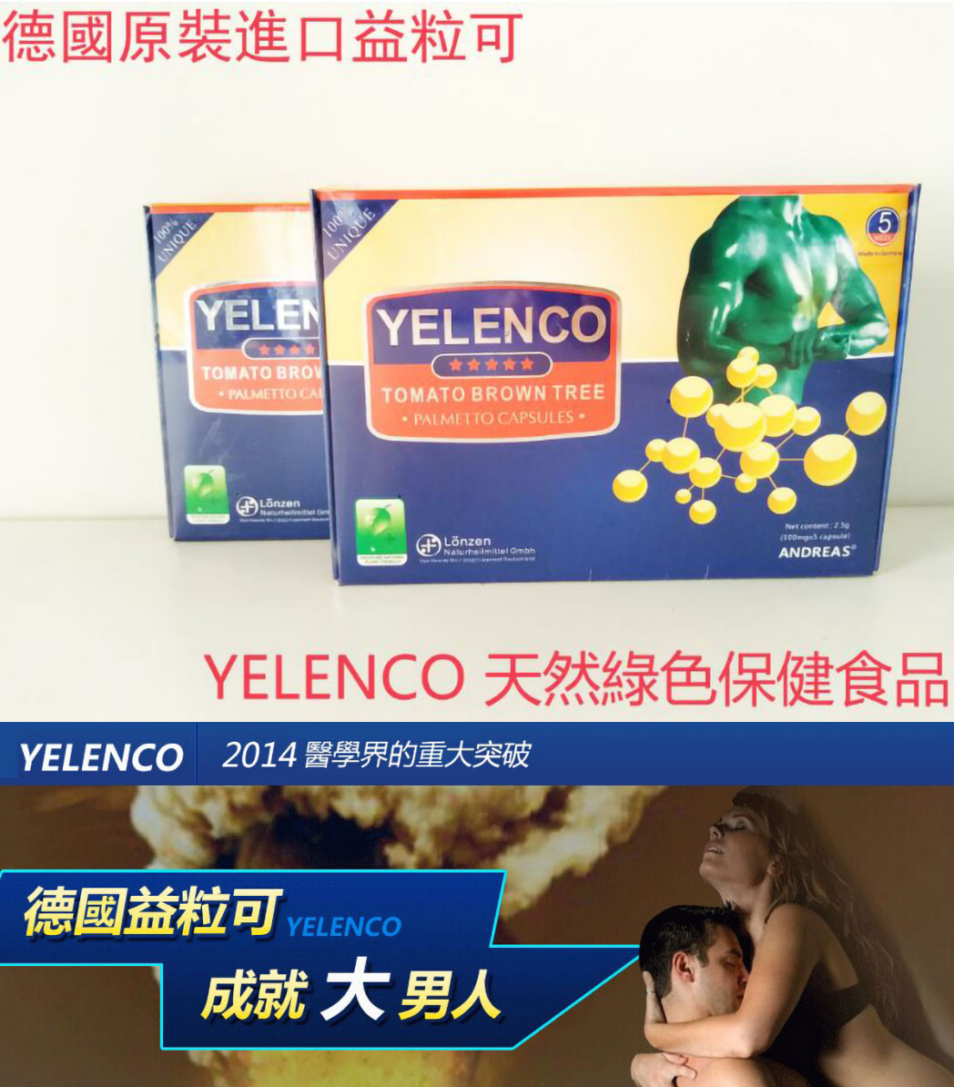 德國原裝進口德國益粒可(YELENCO)進入台灣市場,以植物荷爾蒙及治療前列腺疾病等宣傳口號和顯著效果迅速占領男性保健品市場,為上千萬陽痿早泄、勃起功能障礙、前列腺疾病、腎虧腎虛等問題患者帶來曙光,重展男人雄風,成就大男人!
