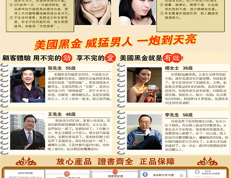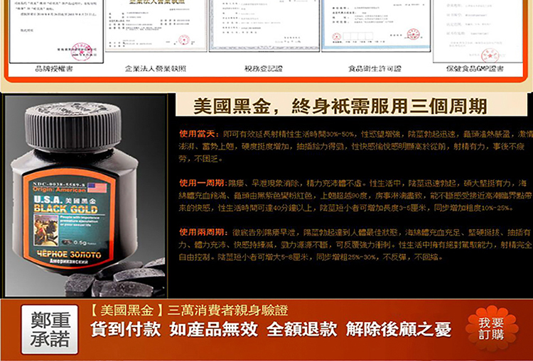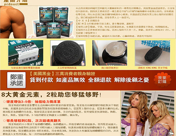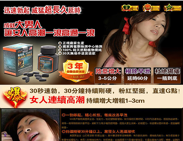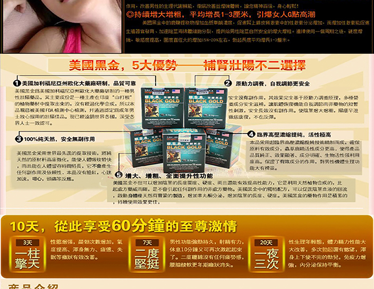 | 产品名称 : | 美國黑金|風靡全球的男性壯陽佳品|中成藥合成溫和無副作用 |