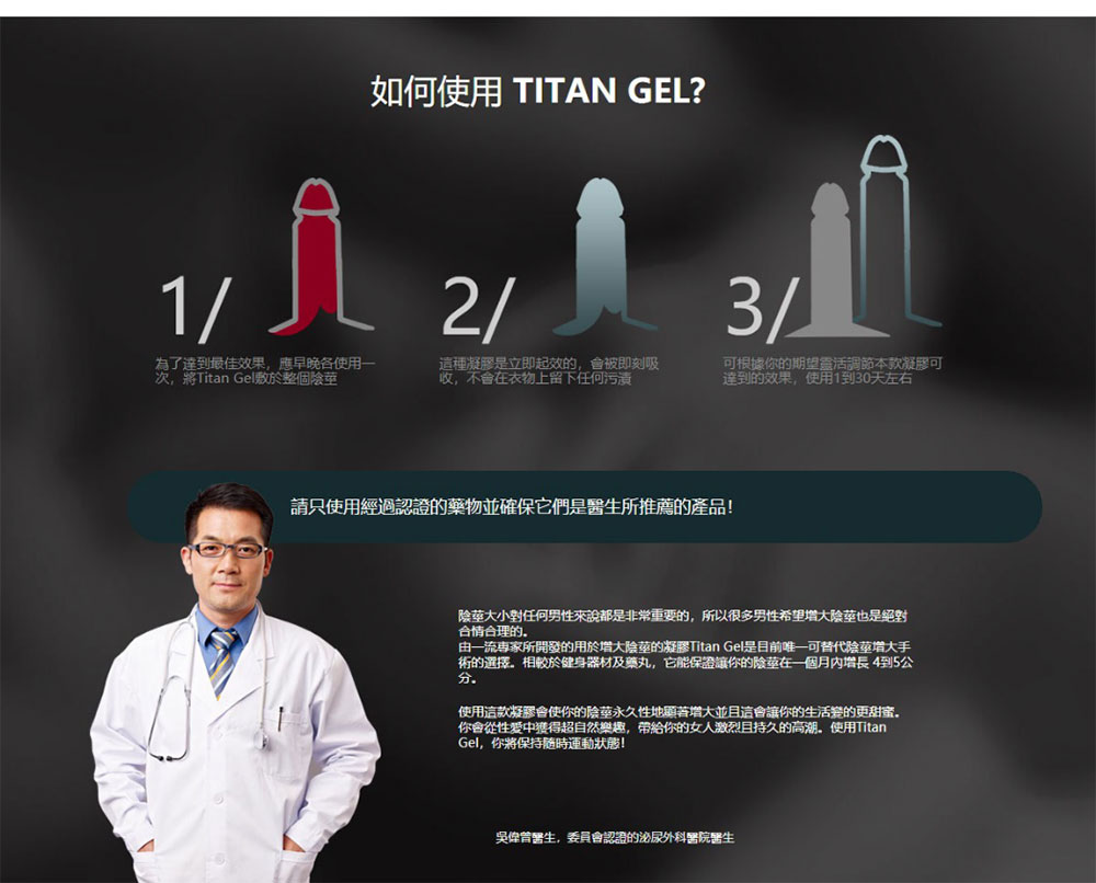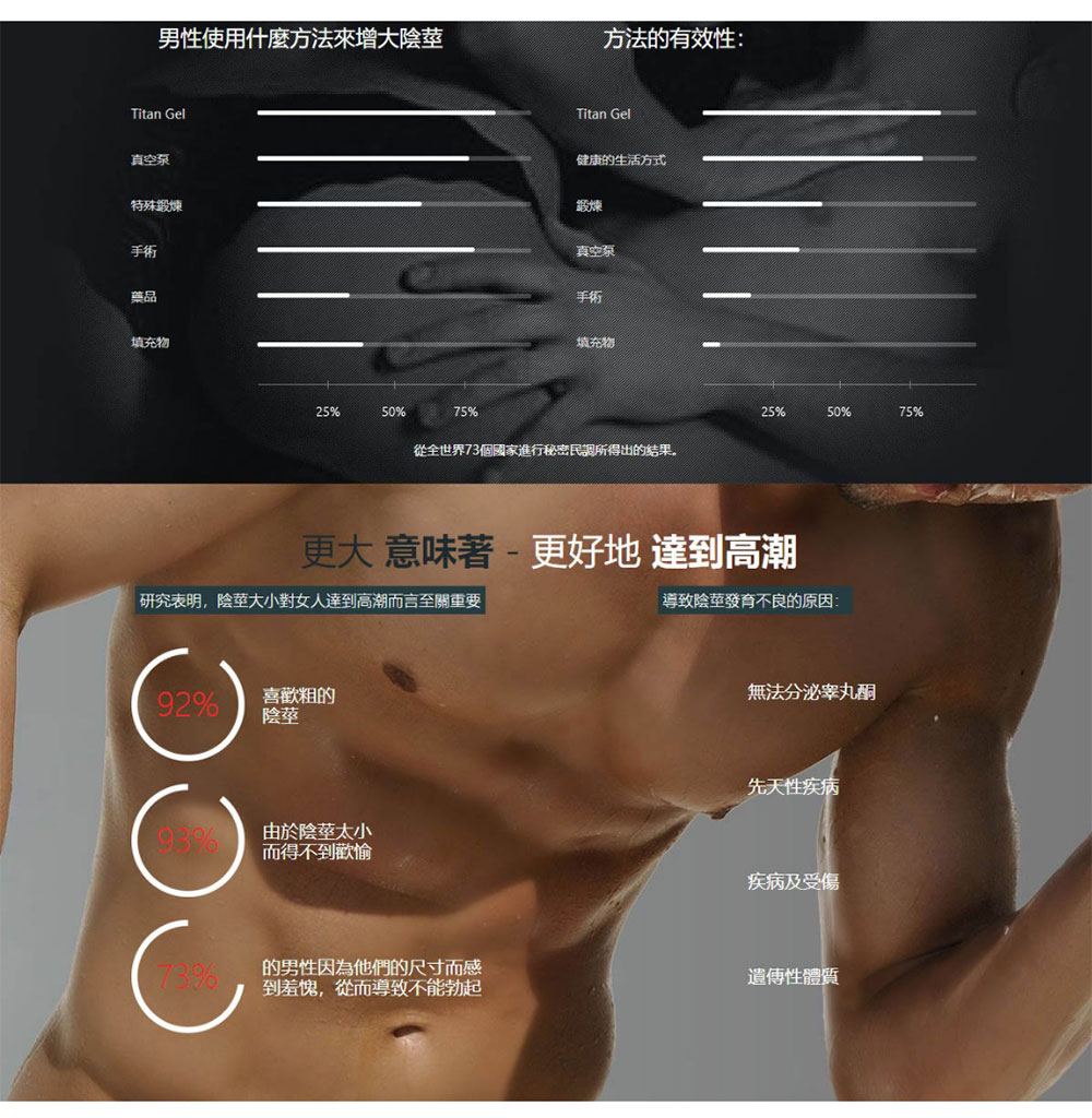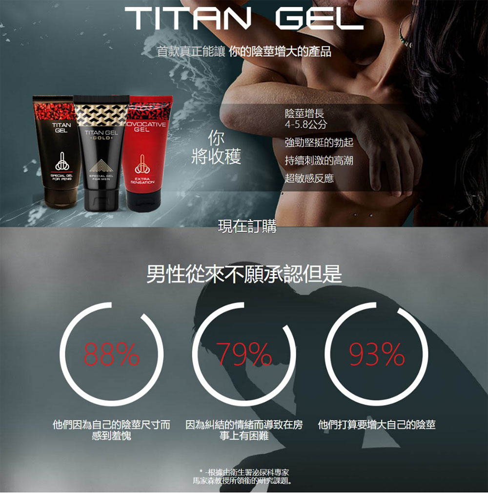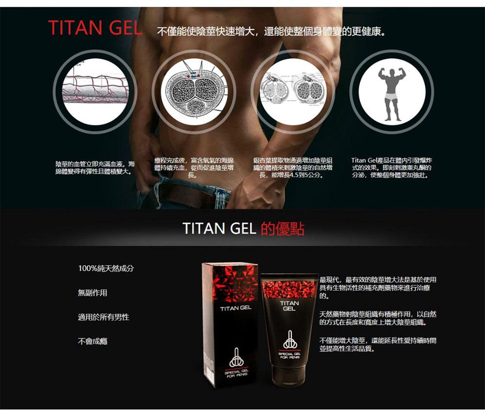 誰都希望自己是大鳥,現在來自俄羅斯的Titan gel泰坦凝膠為您解決煩惱;所有用過這個凝膠的男人以及他們的伴侶對結果都十分滿意,消費者對Titan Gel的評論也十分積極。現在你可以在認可代理及分銷商買到這個正貨產品,只要正常使用,就會產生積極的效果,只要使用一個月左右,你陰莖就可增大10–30%,長度增長大1cm。
