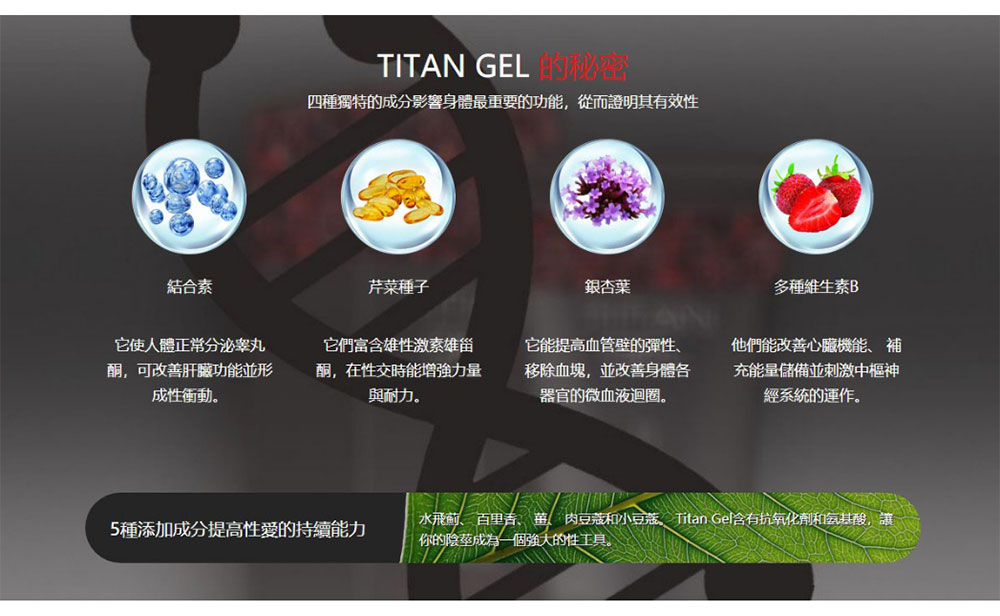 Titan Gel產品在體內引發爆炸式的效果。即刻刺激睾丸酮的分泌,使整個身體更加強壯。