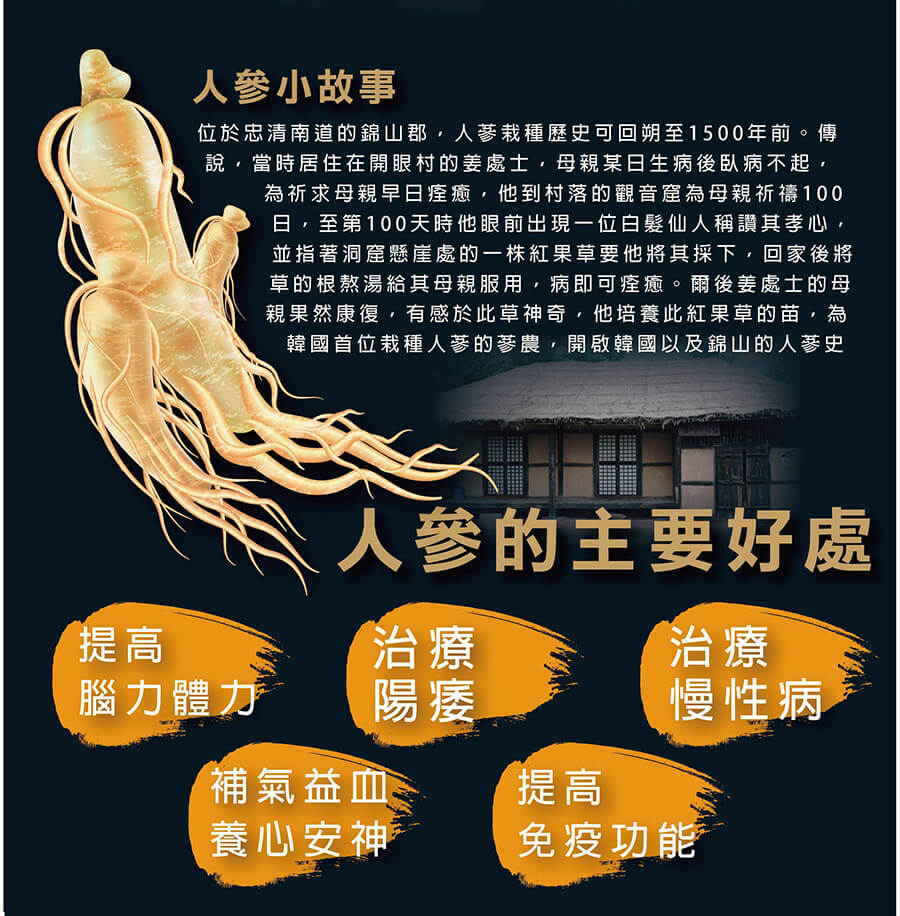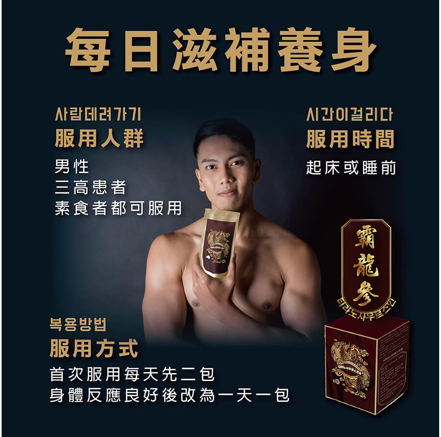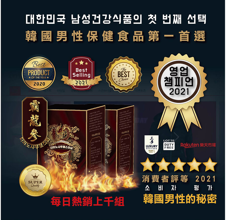 韓國霸龍參라노사우르스 인삼是目前韓國男性保養最熱銷的保健壯陽產品,也是韓國男性保健食品第一首選,霸龍參成分採用的為50%高濃縮的韓國六年人參+50%男性精華原料(南非醉昔、透納葉、瑪卡…等)黃金比例完美配方製作而成,選用韓國六年種植的高純度根人參,不管是三高患者或者素食者都可以服用,能夠讓人安心放心的食用…