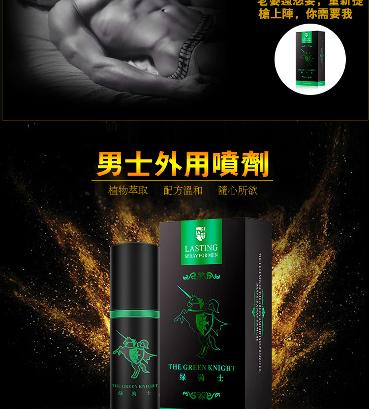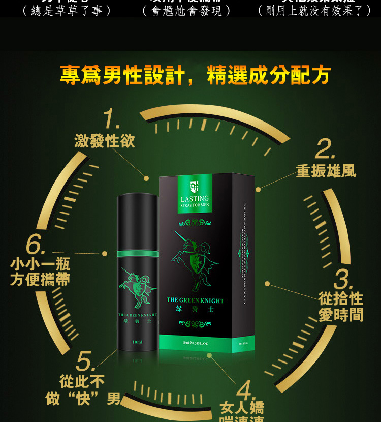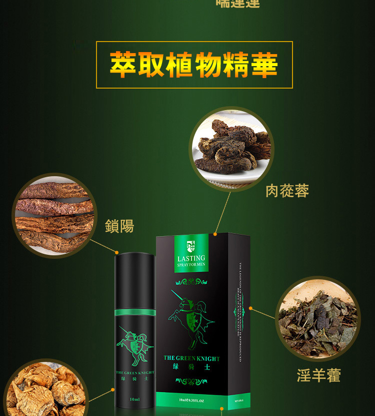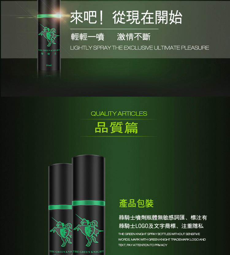 法國綠騎士持久液,針對男性早洩問題而開發的持久產品,性愛時間太短,力不從心草草了事的解決了 讓愛人達不到高潮,綠騎士專為男性設計研發,精選植物精華,吸收快,效果強勁,噴一噴激發性欲,給她愛的時間久一些 也多一些享受,重振男人雄風。