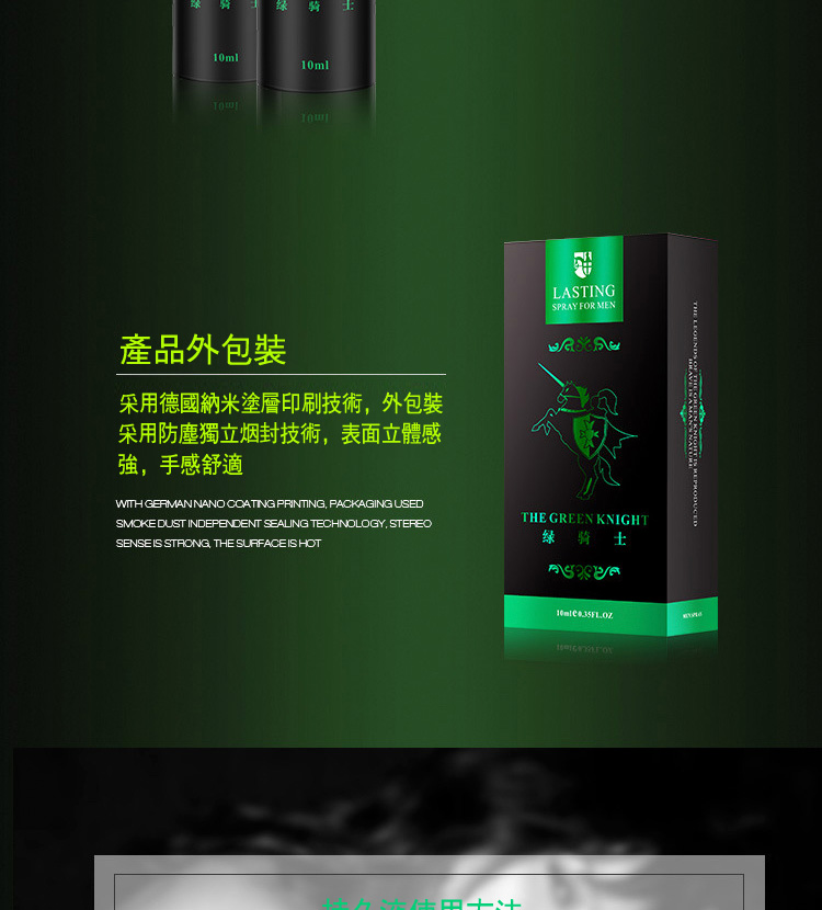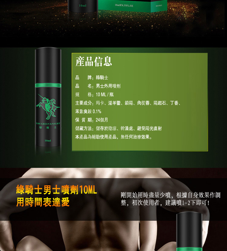 | 产品名称 : | 法國綠騎士持久噴劑|延時持久|延時不麻木|持久噴霧|男性外用強效延時噴劑10ML |