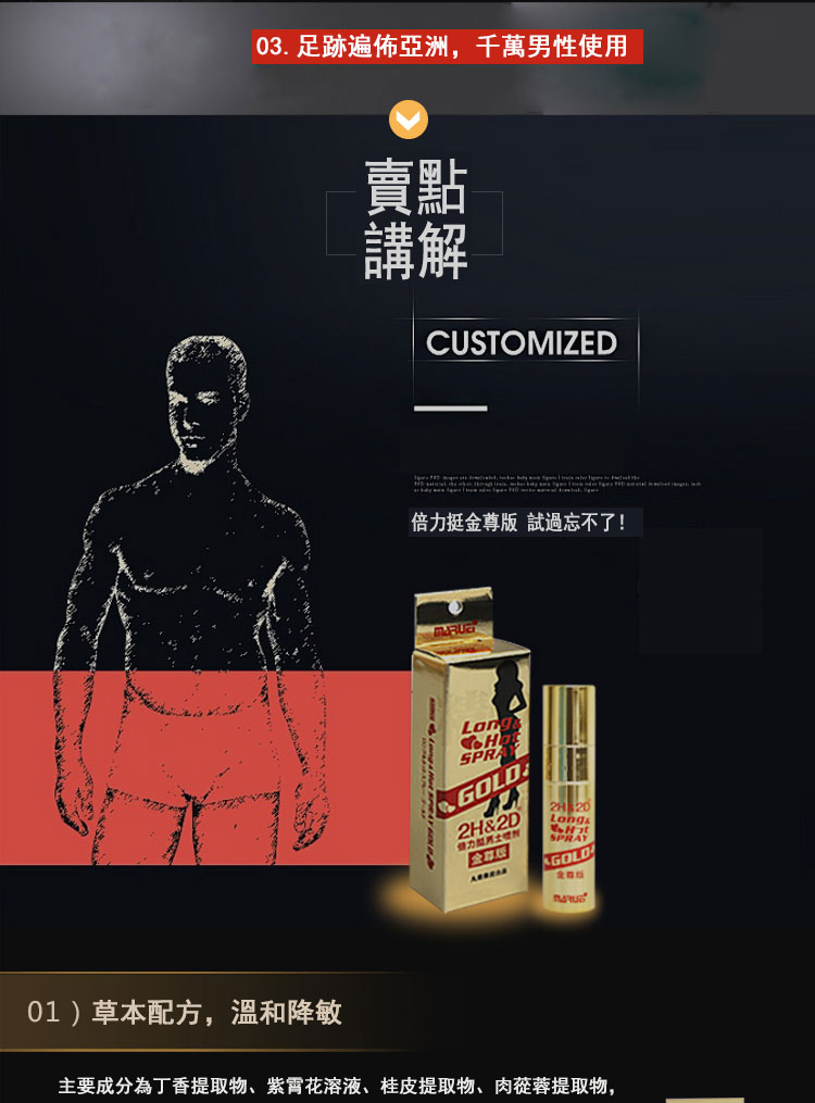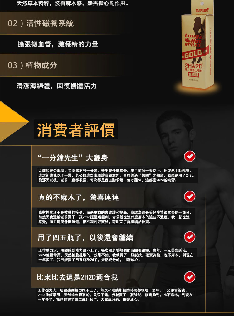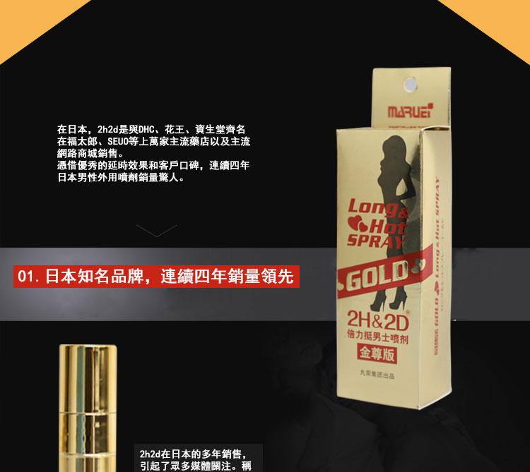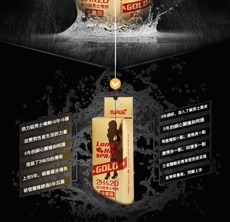 日本丸榮2H2D持久液金尊版是升級版起效快藥效更強,純植物草本提取,無副作用,不含酒精和刺激性的化學成分,使用後不麻木,有效延長30-60分鐘。